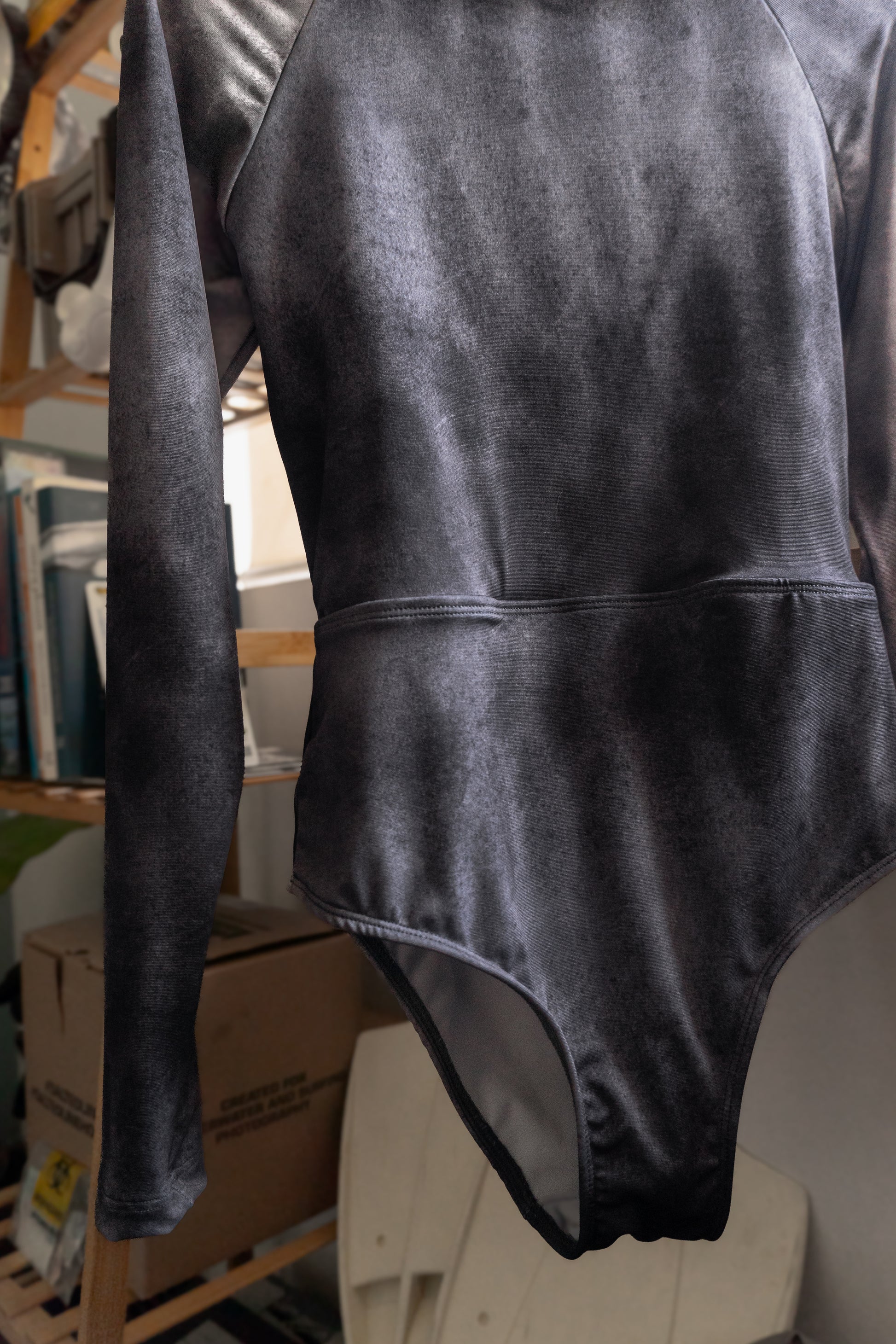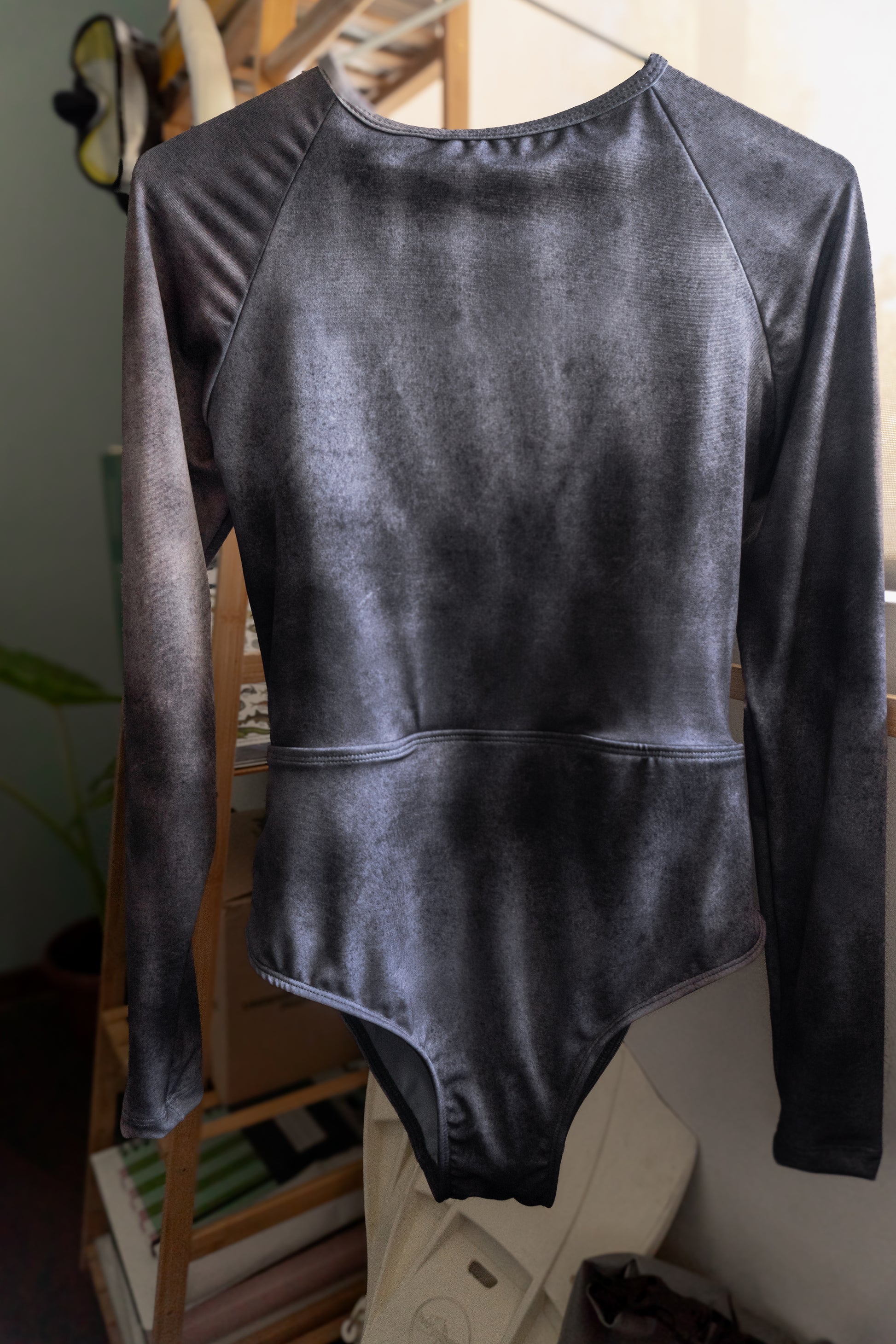 Inspirado en los patrones indomables del tiburón tigre y construido a partir de las fotografías originales de Juan Quinteros, este enterito de manga larga es una declaración de fuerza y carácter.